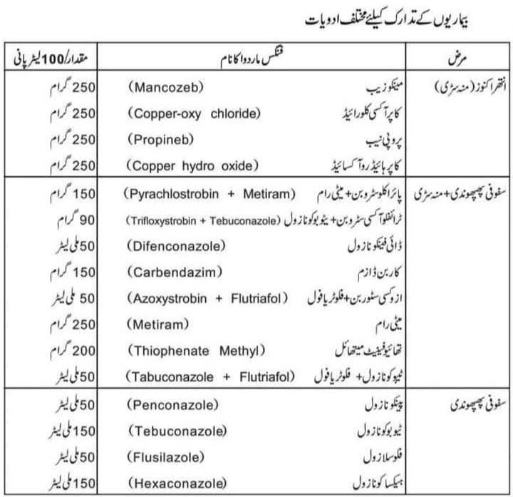 لہذا پھول نکلنے کے ابتدائی دنوں میں جھلساؤ، درمیان میں جب 50 فیصد پھول آنے پر وسیع الثر جبکہ آخری سٹیج پر سفوفی پھپھوند سے بچاؤ کی پھپھوند کُش ادویات سپرے کی جاتی ہے۔